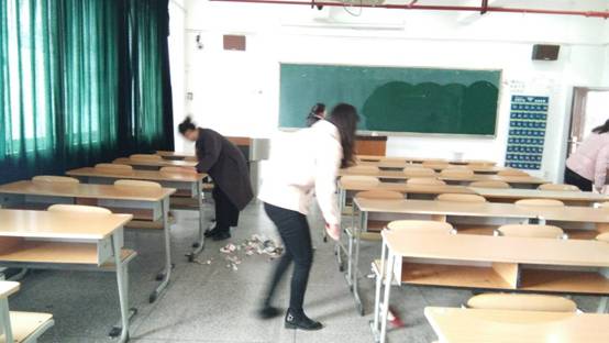 2019年3月2日11:45分,12名积极向上,热心奉献的志愿者在15栋教学楼下集合,副会长吴桃燕将参与活动的志愿者平均分为两组。第一组在会长任云芳的带领下打扫15栋教学楼3楼教室,第二组则同副会长一起打扫15栋教学楼4楼教室。分工明确后,12点整开始进行教室卫生大扫除。每个志愿者都积极清理垃圾,不怕脏,不喊累,积极配合。走道上、课桌里均已不见塑料袋、瓜皮纸屑的踪影;黑板上被写过的粉笔痕迹和讲桌上的粉笔灰被擦拭得一尘不染,教室垃圾桶里满满的垃圾也被清理得干干净净。下午16:00,此次活动圆满结束,志愿者们在15栋教学楼下拍照留念,记下这自豪、光荣的时刻。