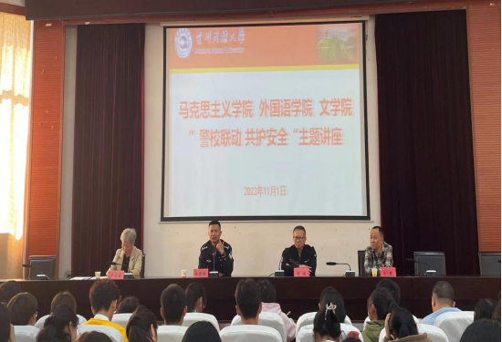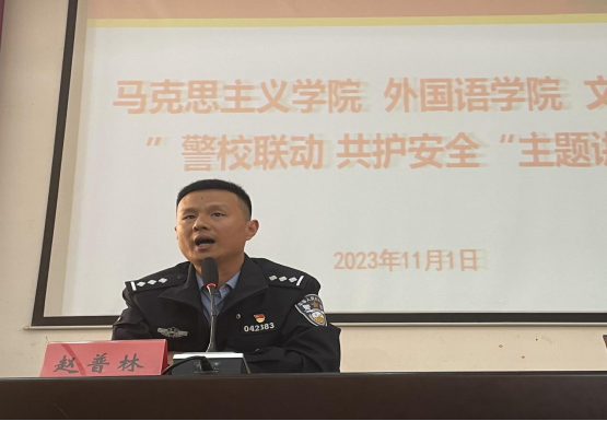 为进一步增强2023级新生的安全意识,切实提高风险应对防范能力,维护学生人身财产安全,营造安全文明、积极健康的校园氛围,2023年11月1日下午13点,学院邀请贵阳市花溪区公安局松山派出所的赵普林警官作为主讲人在花溪校区15栋圆形会议室开展了“警校联动,共护安全”的专题讲座。