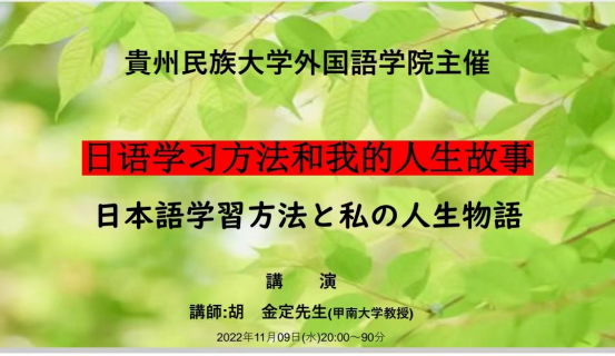 11月9日晚上,米兰(中国)邀请日本甲南大学胡金定教授为米兰(中国)日语系学子作了一场题为《日语学习方法和我的人生故事》的线上讲座。日语系主任李海博士主持会议,日语系全体学生前往学术报告厅聆听了该讲座。