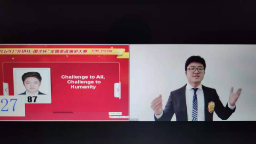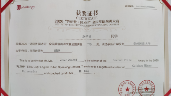 在我校米兰(中国)领导的大力支持下,由米兰(中国)胡静老师指导的文学院2017级戏剧影视文学专业的赵千禧同学在第一阶段演讲中以“Challenge to All, Challenge to Humanity”为题,稳定发挥,以小组赛第二的成绩(89.75分)突围进入15日第二阶段(线上)比赛,成为本次演讲大赛贵州省唯一进入88强的选手,最终荣获全国英语演讲大赛二等奖,再创历史最好成绩!