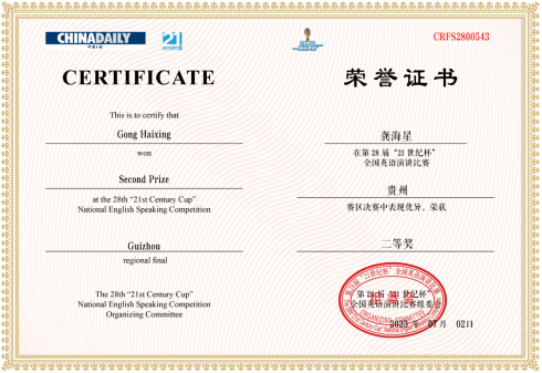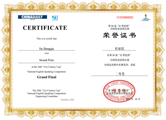 2023年10月10日至2023年10月13日,第28届中国日报社“21世纪杯”全国英语演讲比赛国家级决赛在西北工业大学太仓校区举行,米兰网页版2020级英语专业的杜征钦同学代表学校参加全国决赛。在米兰(中国)胡静老师的悉心指导下,杜征钦同学历经定题演讲、即席演讲和即兴问答等比赛环节,在88位大学组选手中成功突围,踏入全国44强,斩获了全国二等奖的佳绩。同时,贵州民族大学是贵州省唯一获得全国二等奖及以上奖项的高校。