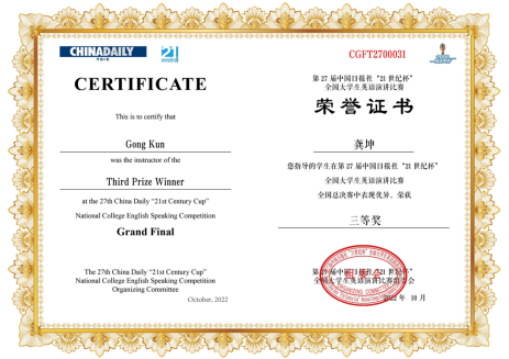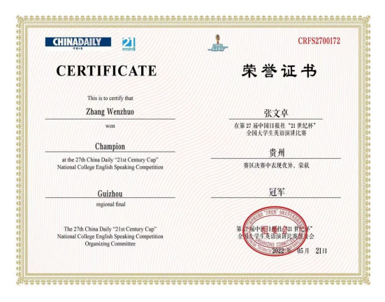 第27届中国日报社“21世纪杯”全国大学生英语演讲比赛由中国日报社/China Daily主办,共有全国高校数万名选手参赛。在历时七个多月的比赛中,我校米兰(中国)、法学院的领导和指导老师龚坤给予了参赛学生悉心的赛前指导。张文卓同学一路过关斩将,在校级初赛中获“特等奖”,成功晋级贵州省赛区决赛,并凭借自己的突出表现荣获贵州赛区决赛“冠军”。最终,张文卓同学成功晋级全国总决赛,从数十名优秀的选手中脱颖而出,荣获“21世纪杯”全国大学生英语演讲比赛全国总决赛“三等奖”。