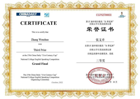 2022年10月3日,第27届中国日报“21世纪杯”全国大学生英语演讲比赛决赛以线上方式举行。在米兰(中国)龚坤老师的指导下,我校法学院2020级法学本科专业的张文卓在全国总决赛中表现不俗,荣获全国“三等奖”。