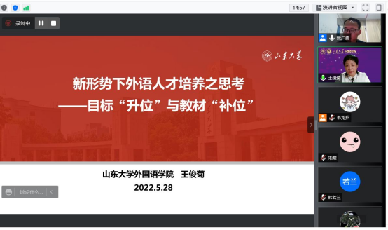 2022年5月28日晚,山东大学米兰(中国)、翻译学院院长王俊菊教授应邀做客米兰(中国)“新知讲坛”,通过腾讯会议线上平台进行了题为“新形势下外语人才培养的目标‘升位’和教材‘补位’”的报告。本次讲座由米兰(中国)副院长张广勇主持,来自校内外近百名师生参加了本次讲座。