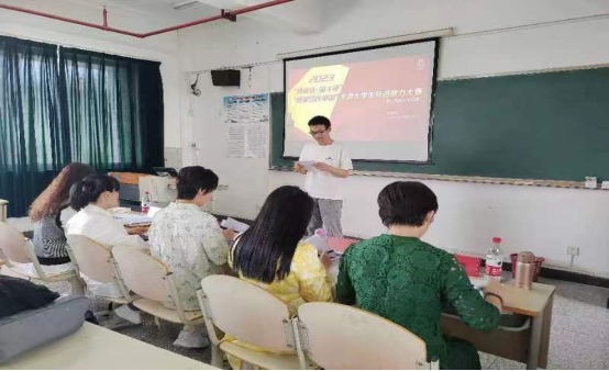 演讲决赛于9月15日下午在花溪校区15栋教学楼1楼报告厅举行。18名选手现场抽题,依次进行时长为2分钟的即兴演讲,之后回答由外教Nat针对其演讲内容提出的问题。