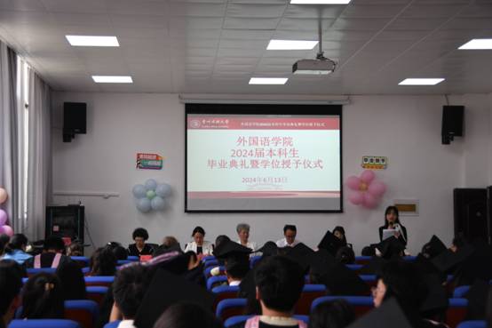 最后,卢文芸书记宣读了《关于授予2024届欧明月等153名毕业生学士学位的决定》。主席台领导为毕业生们逐一拨穗并颁发学位证书。