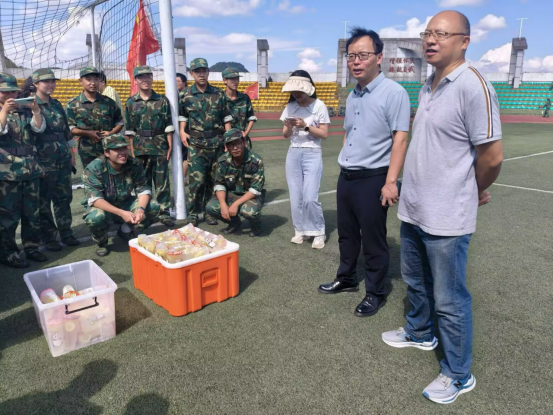 “同学们辛苦了,快喝点水降降温!”张广勇院长一边递出饮品,一边关切地询问大家的训练感受和身体状况。