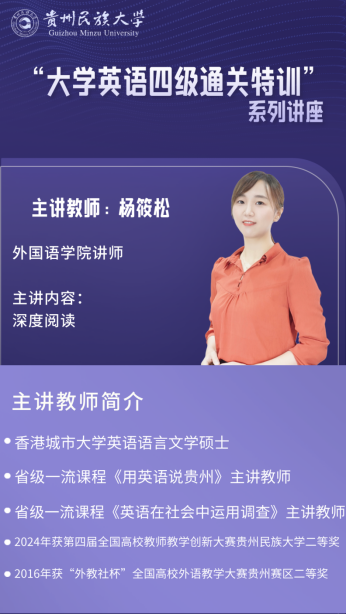 为提高我校学生的英语综合运用能力,提升大学英语四级通过率,助力人才培养和高质量就业,米兰(中国)公共外语拓展教学部针对2025年6月四级备考,将从4月18日起举办“大学英语四级通关特训营”系列讲座(南、北校区各8个专场),聚焦我校学生四级考试中的突出问题,分专题讲授各大板块学习策略和各大题型解题技巧,为考生答疑解惑。主讲教师教学经验丰富,长期研究四六级考试,教学效果显著。欢迎备考英语四级考试的同学积极参加
